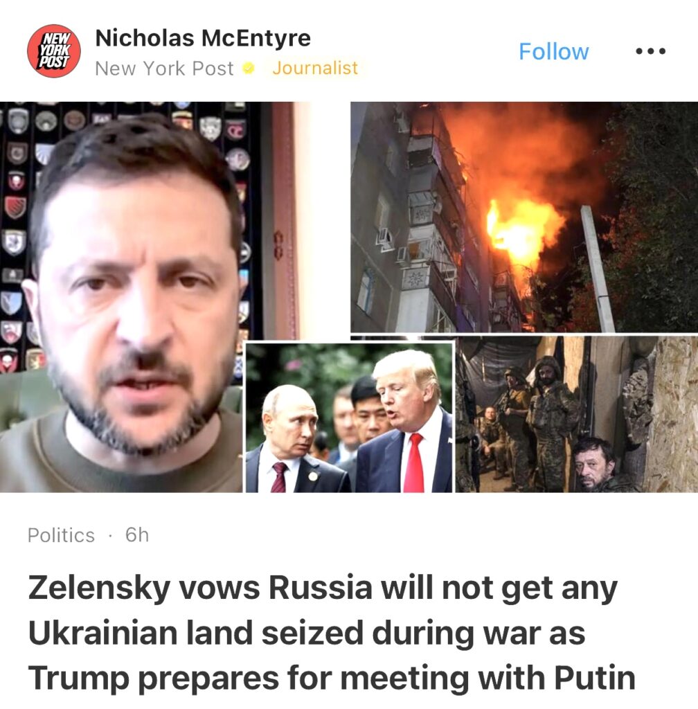 13。据New York Post报道,特朗普准备与普京会面之际,泽连斯基誓言俄罗斯不会得到在战争期间侵占的乌克兰任何土地。