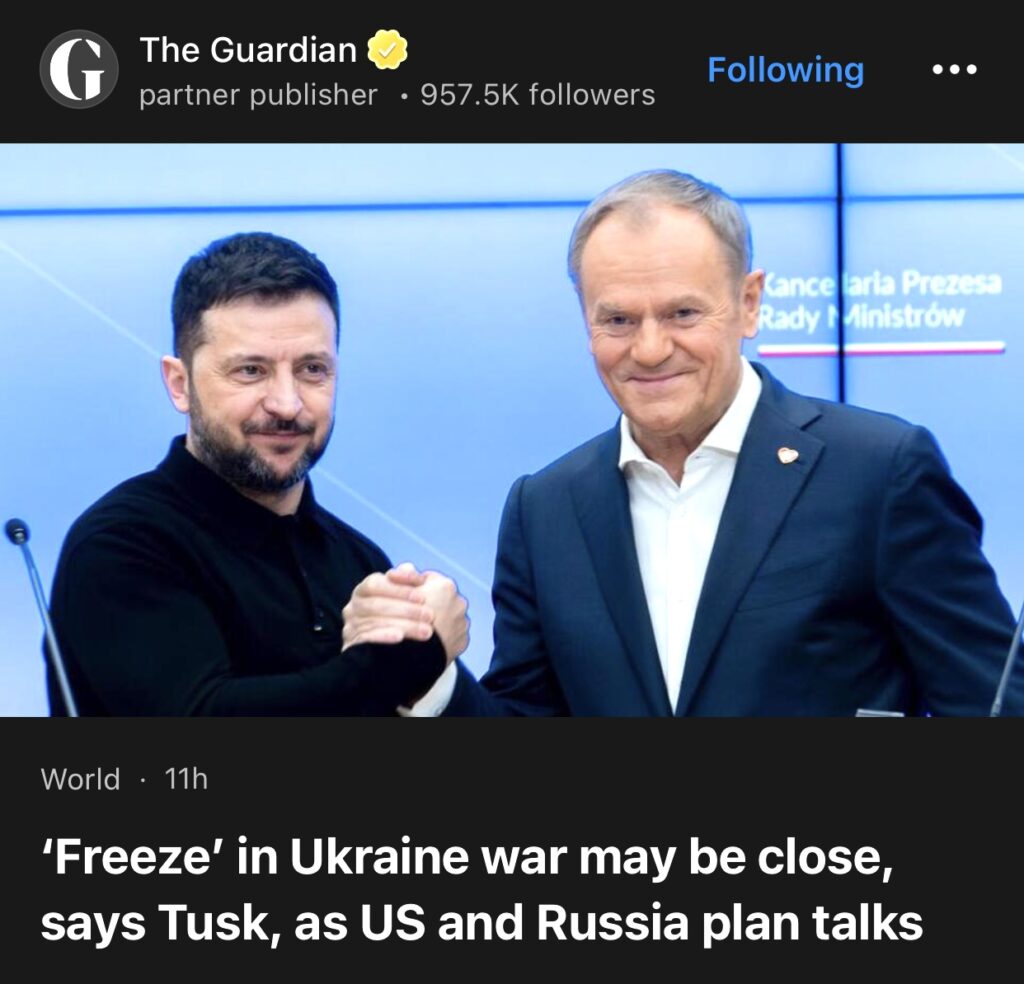 7。据The Guardian报道,波兰总理周五表示,乌克兰战争可能即将“冻结”,而白宫和克里姆林宫正在推进唐纳德·特朗普和弗拉基米尔·普京在未来几天举行高层峰会的讨论。