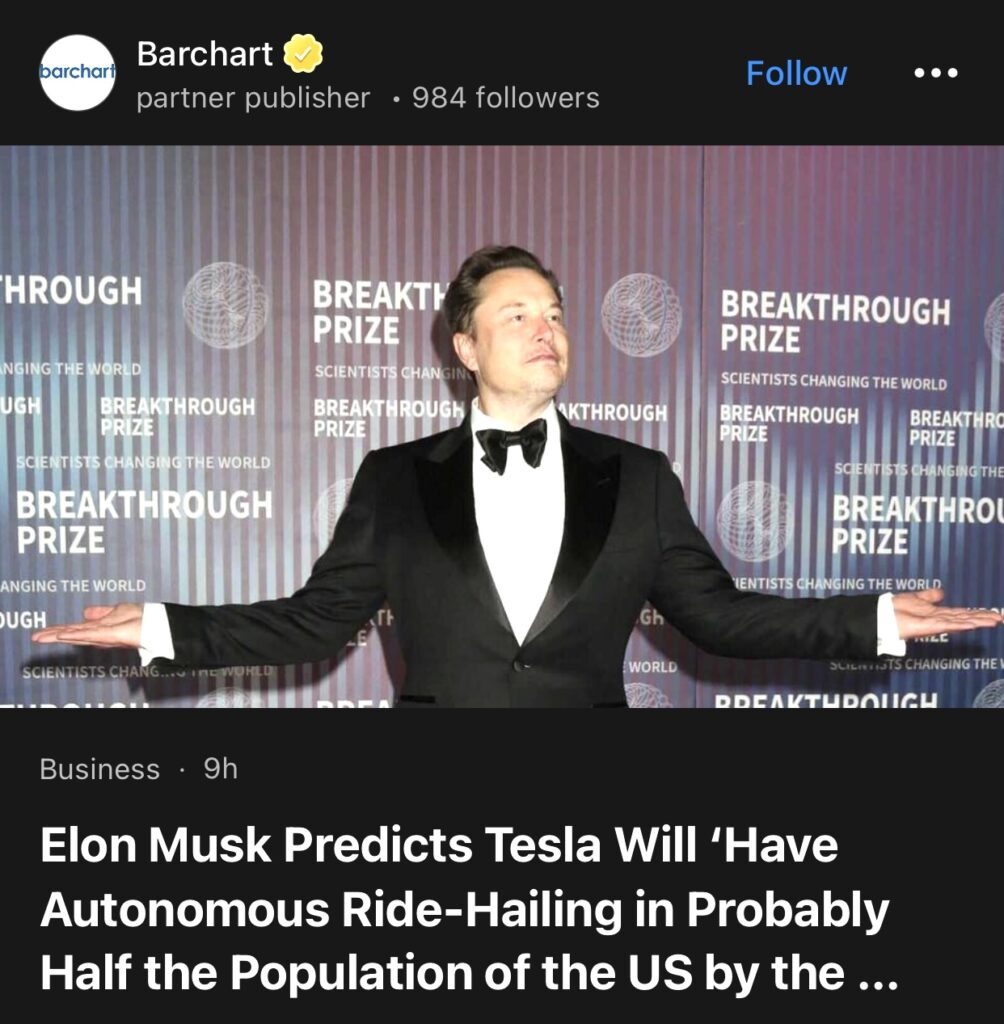 8。据Barchart报道,埃隆·马斯克预测特斯拉“到今年年底将为美国一半人口提供自动驾驶叫车服务”。