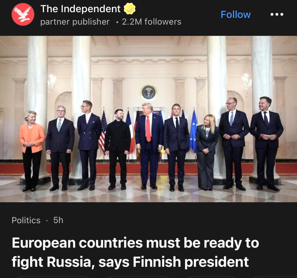 7。据The Independent报道,芬兰总统称欧洲国家必须做好与俄罗斯作战的准备。