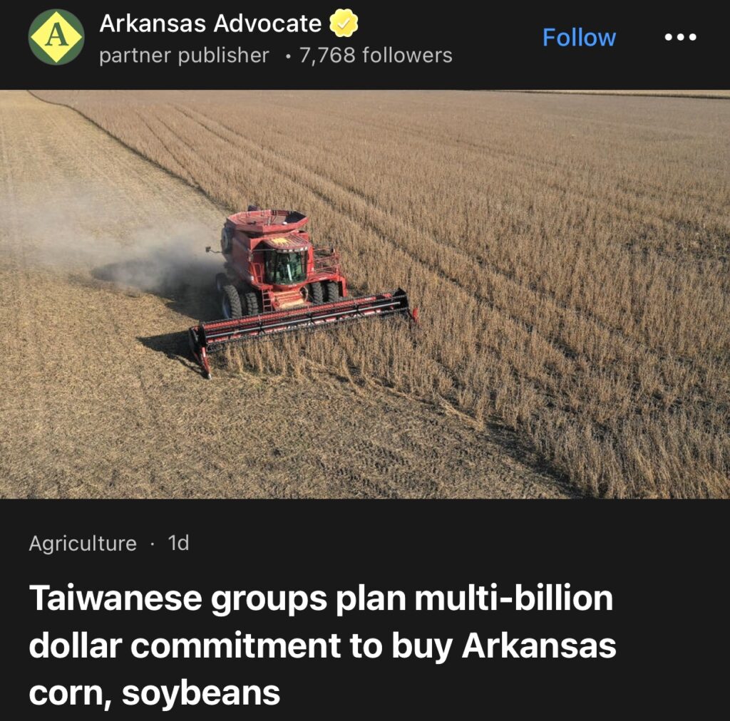 6。据Arkansas Advocate报道,台湾集团计划斥资数十亿美元购买阿肯色州玉米和大豆。