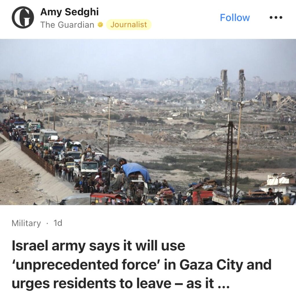 3。据The Guardian报道,以色列军队表示将在加沙城使用“前所未有的武力”,并敦促居民离开。