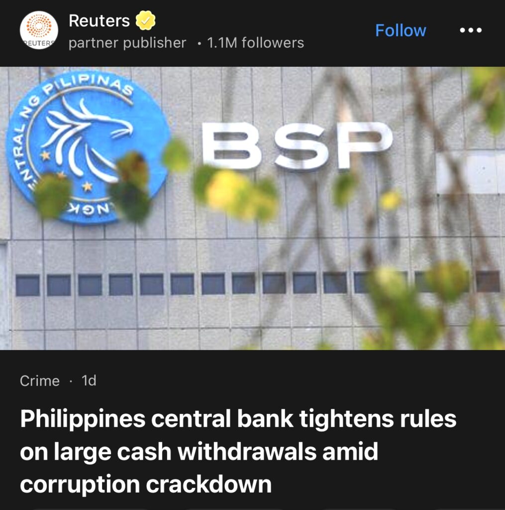 12。马尼拉(路透社)——菲律宾央行加强了对大额现金提取的控制,要求银行对超过 50 万比索(8,748.75 美元)的交易进行“加强尽职调查”,以遏制洗钱活动。