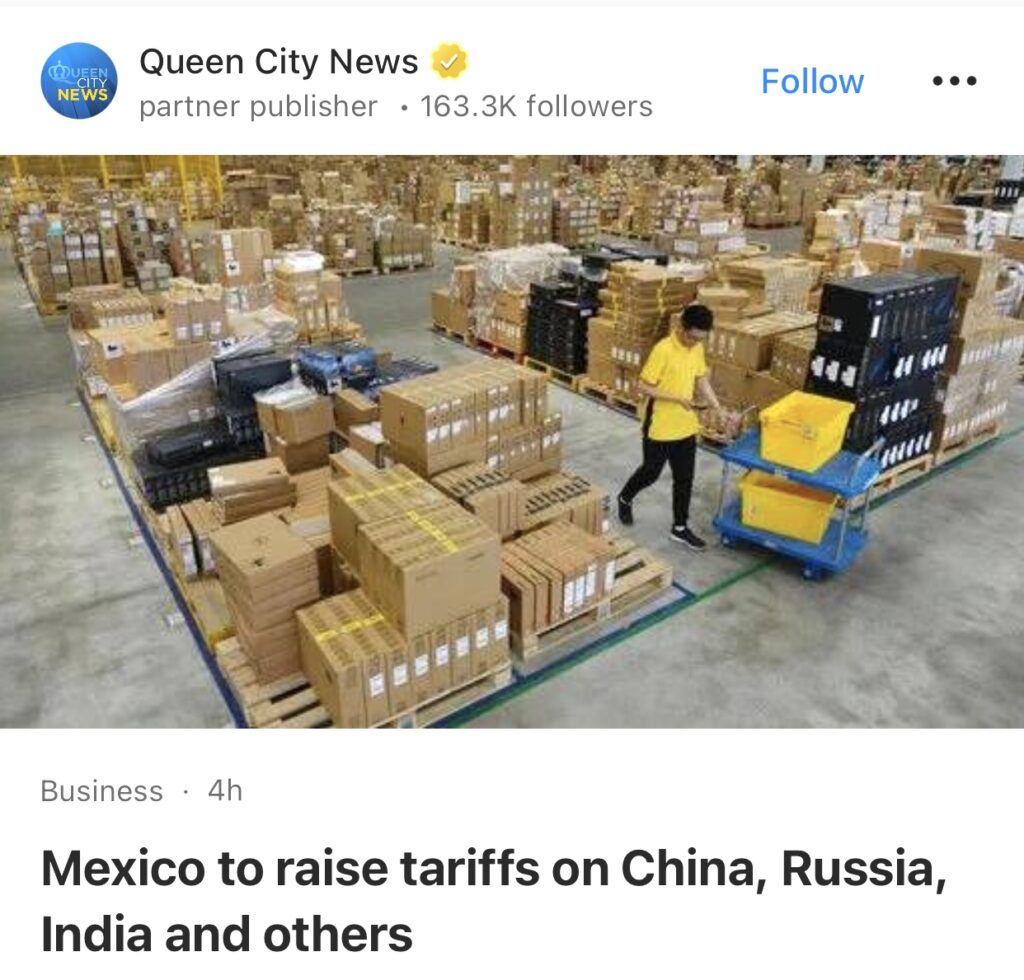 7。据Queen City News报道,墨西哥将提高对中国、俄罗斯、印度等国的关税。