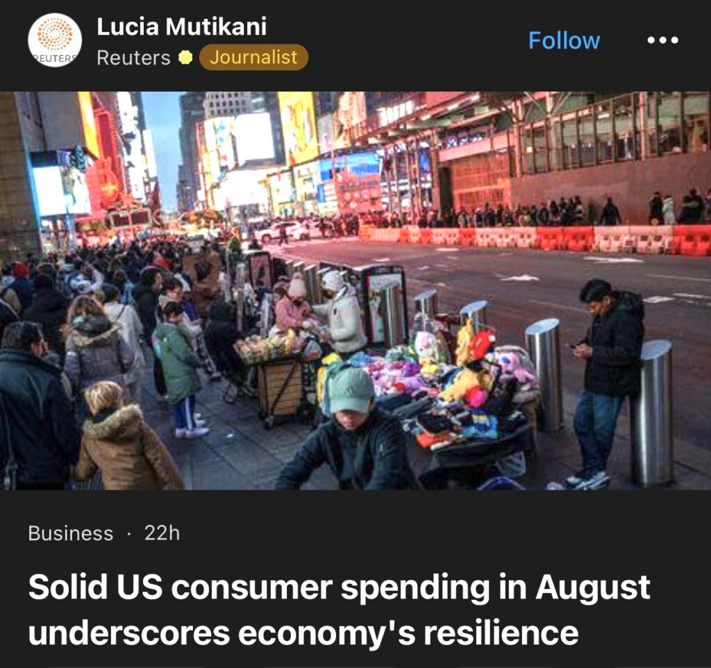 14。华盛顿(路透社)——由于家庭外出度假和外出就餐,美国 8 月份消费者支出增幅略高于预期,使第三季度经济保持稳固基础,同时通胀继续稳步上升。