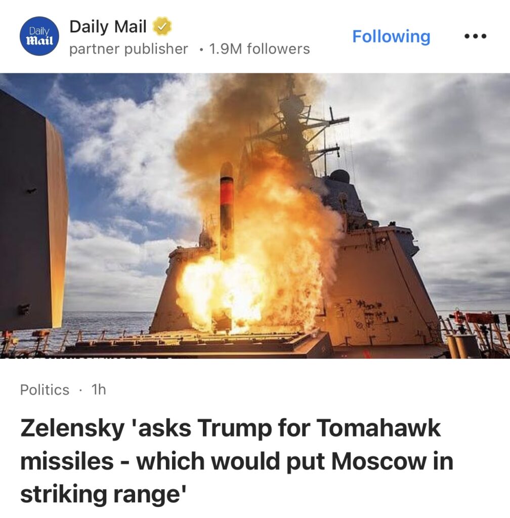 3。据Daily Mail报道,泽连斯基“向特朗普索要战斧导弹——这将使莫斯科处于打击范围之内”。