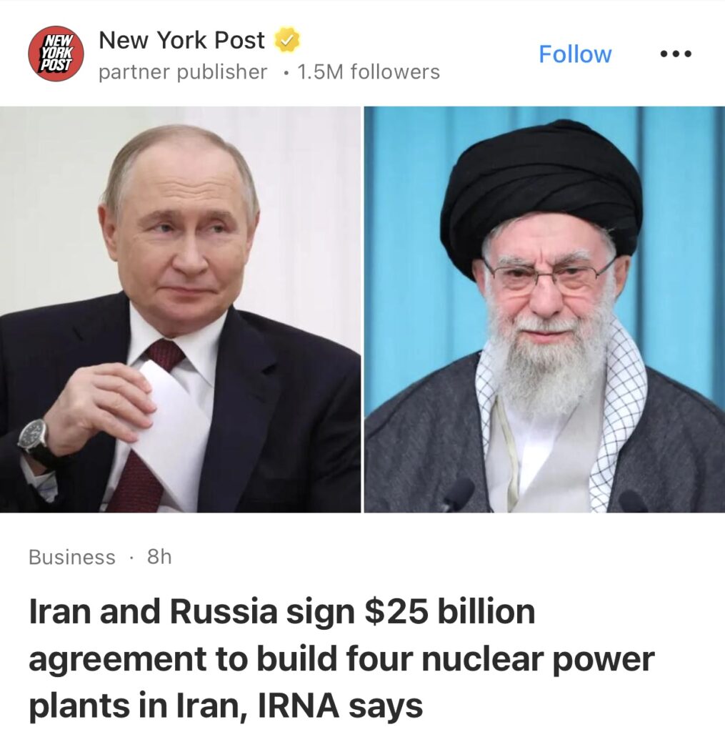 1。据New York Post报道,伊朗伊斯兰共和国通讯社称,伊朗和俄罗斯签署价值250亿美元的协议,将在伊朗建造四座核电站。