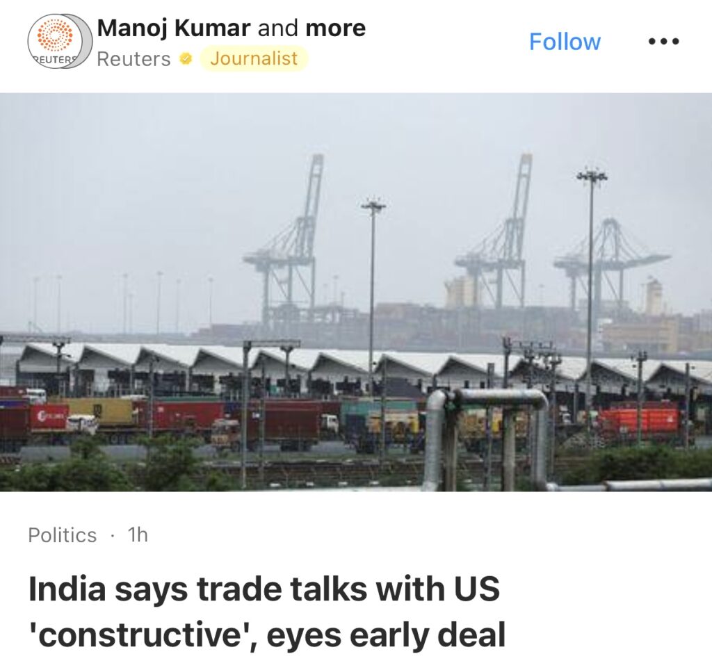 2。据Reuters报道,印度称与美国的贸易谈判“富有建设性”,期待早日达成协议。