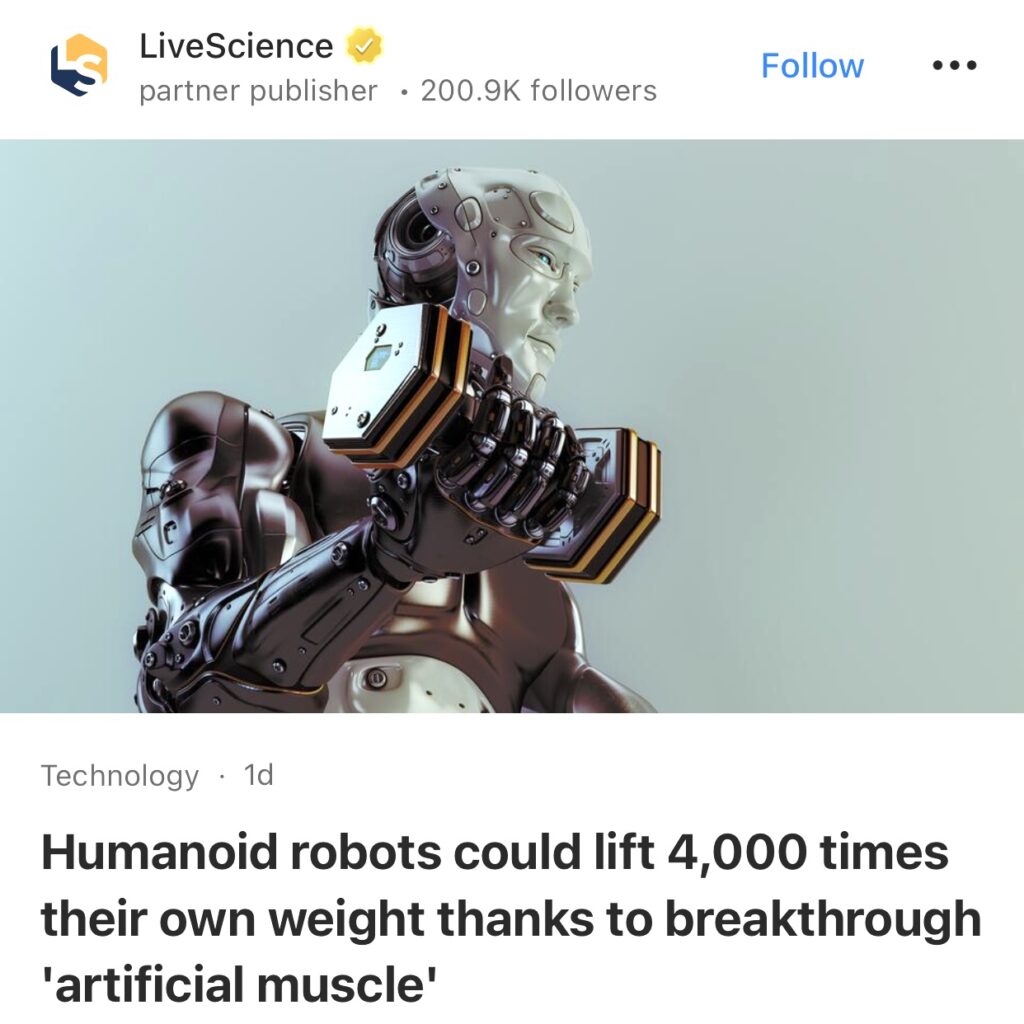 6。据LiveScience报道,韩国研究人员研制出一种人造肌肉,可以举起自身体重约4000倍的重物。他们表示,这种人造肌肉未来可用于人形机器人。