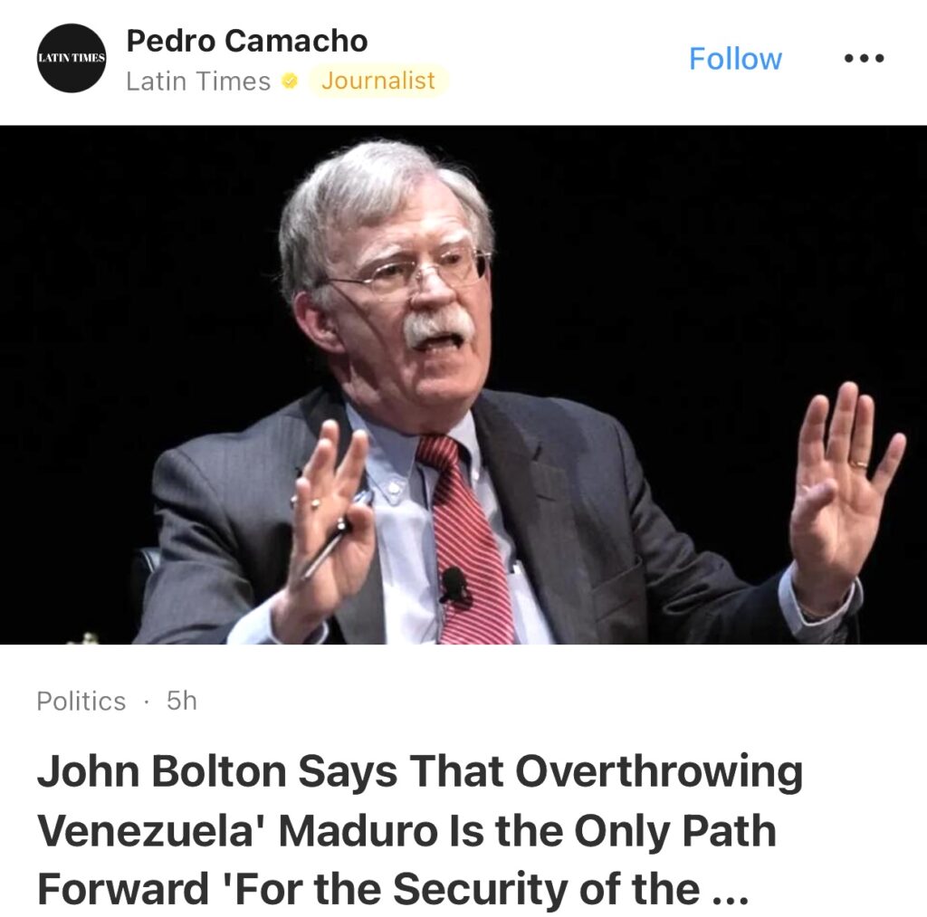4。据Latin Times报道,约翰·博尔顿称,推翻委内瑞拉“马杜罗”政权是“西半球安全”的唯一出路。