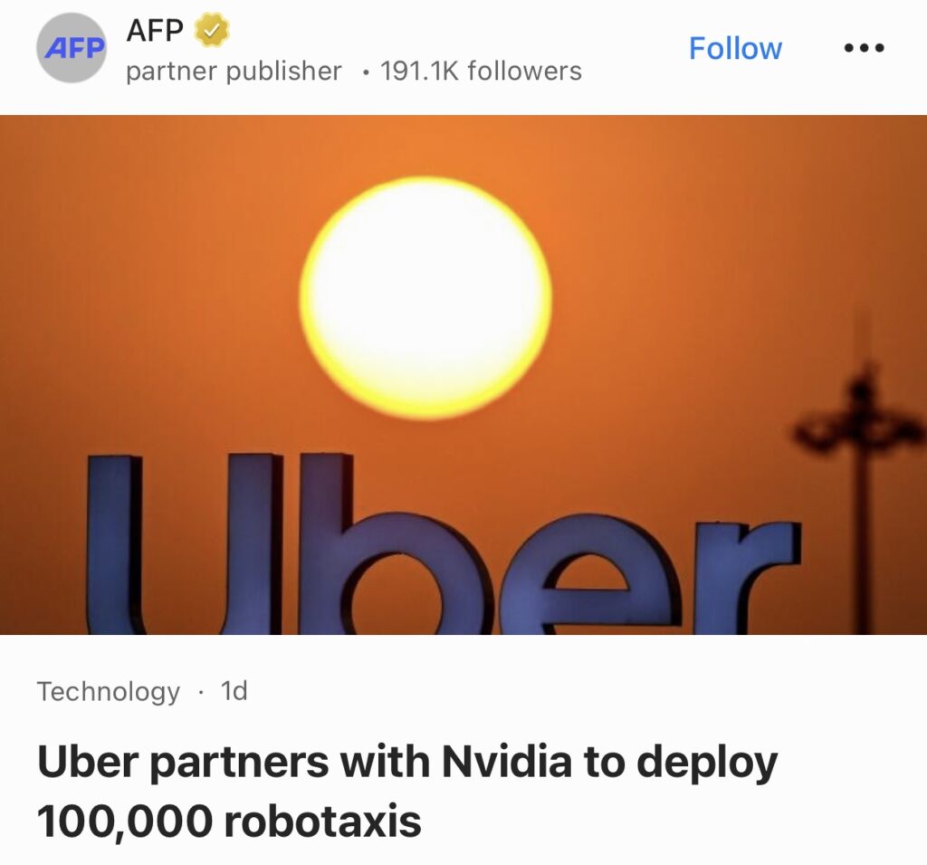 7。据AFP 报道,Uber 与 Nvidia 合作部署 10 万辆机器人出租车。