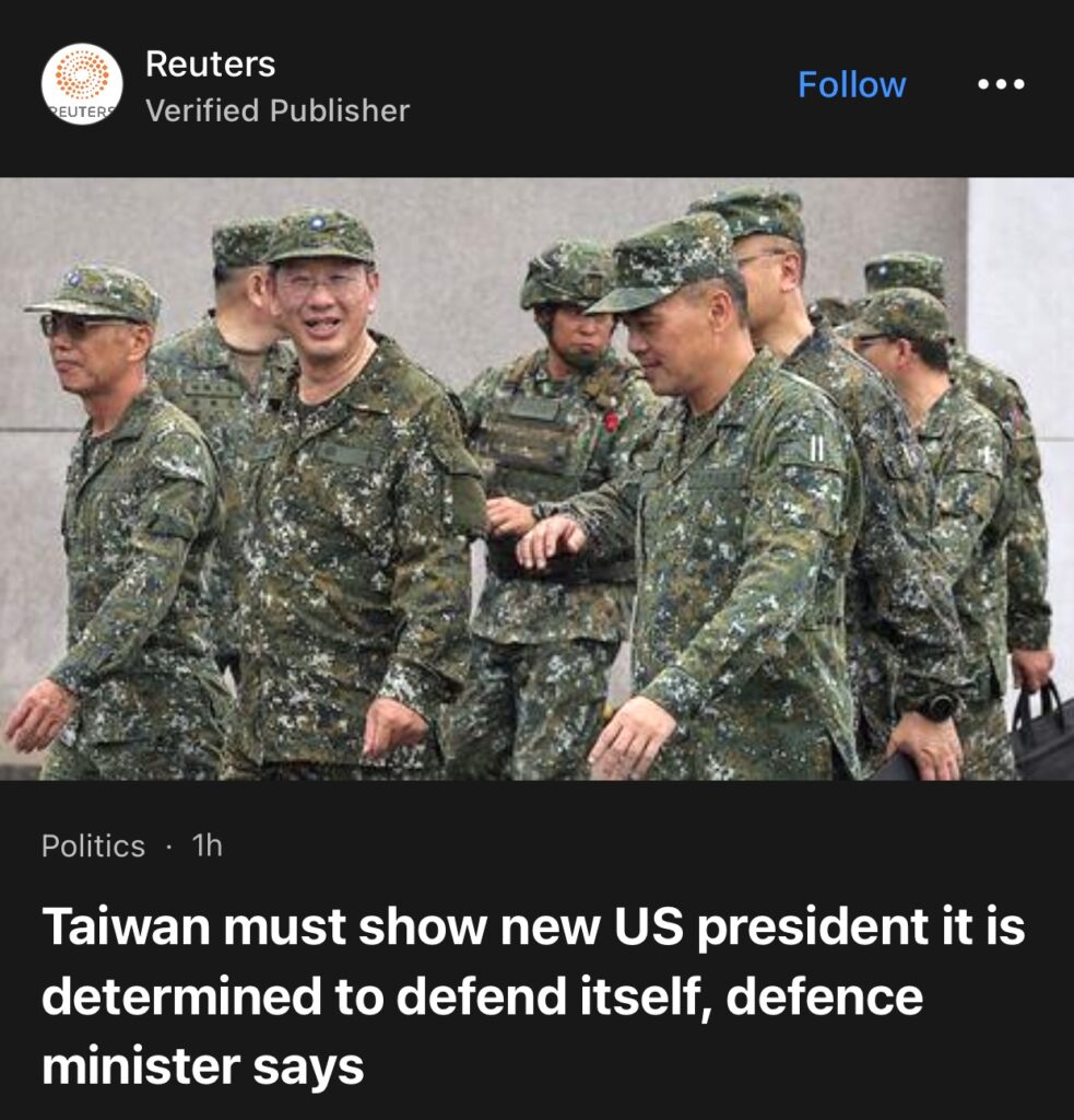 9。据Reuters报道,台湾国防部长表示,台湾必须向美国新任总统展示其保卫自己的决心。