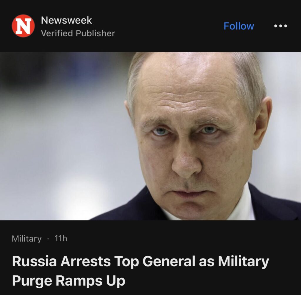 4。据塔斯社报道,俄罗斯高级将军因受贿指控被捕。俄罗斯总统弗拉基米尔·普京继续清洗其高级军事官员,逮捕了米尔扎·米尔扎耶夫少将。