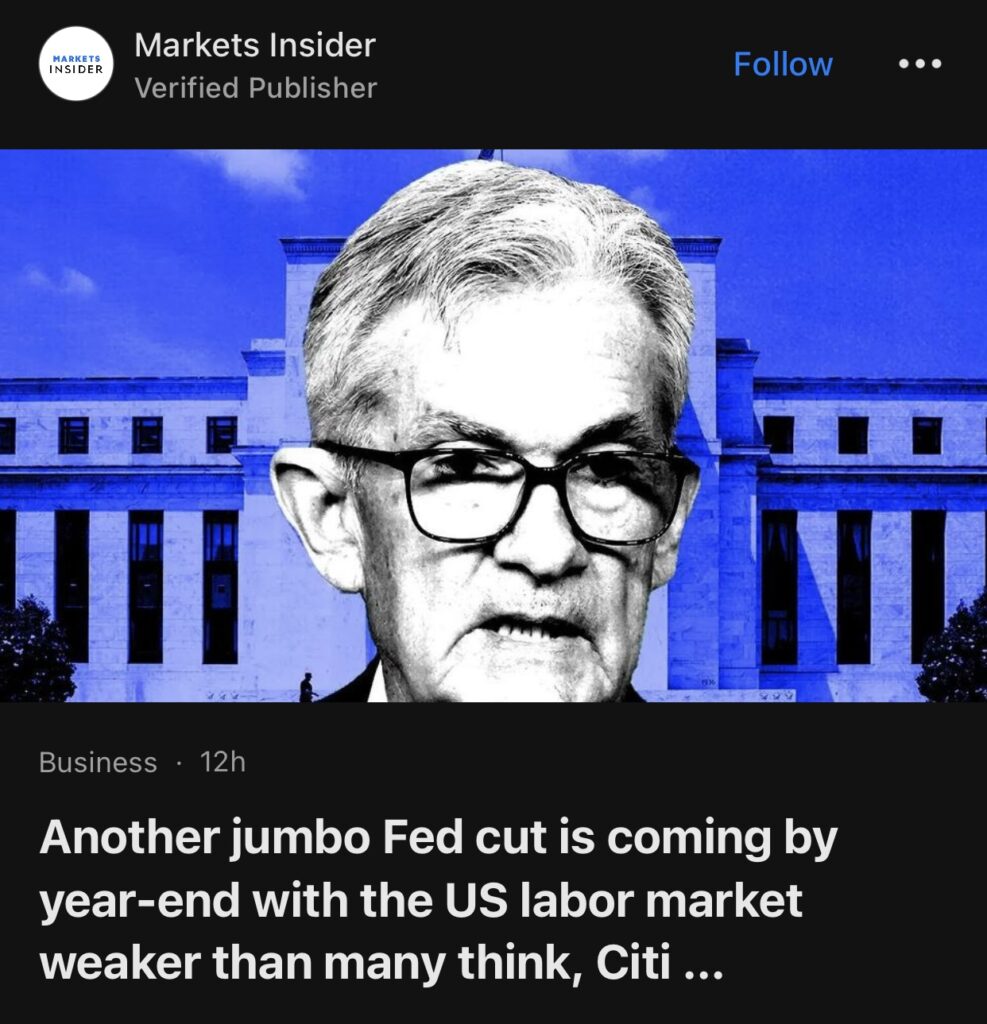 15。据Markets Insider报道,花旗经济学家表示,美联储将在年底前再次大幅降息,因为美国劳动力市场比许多人想象的要弱。