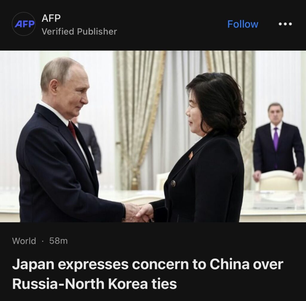 10。据AFP 报道,日本最高国家安全官员表示,两人在北京举行会谈后,他就朝鲜与俄罗斯深化关系向中国外长表达了“严重关切”。