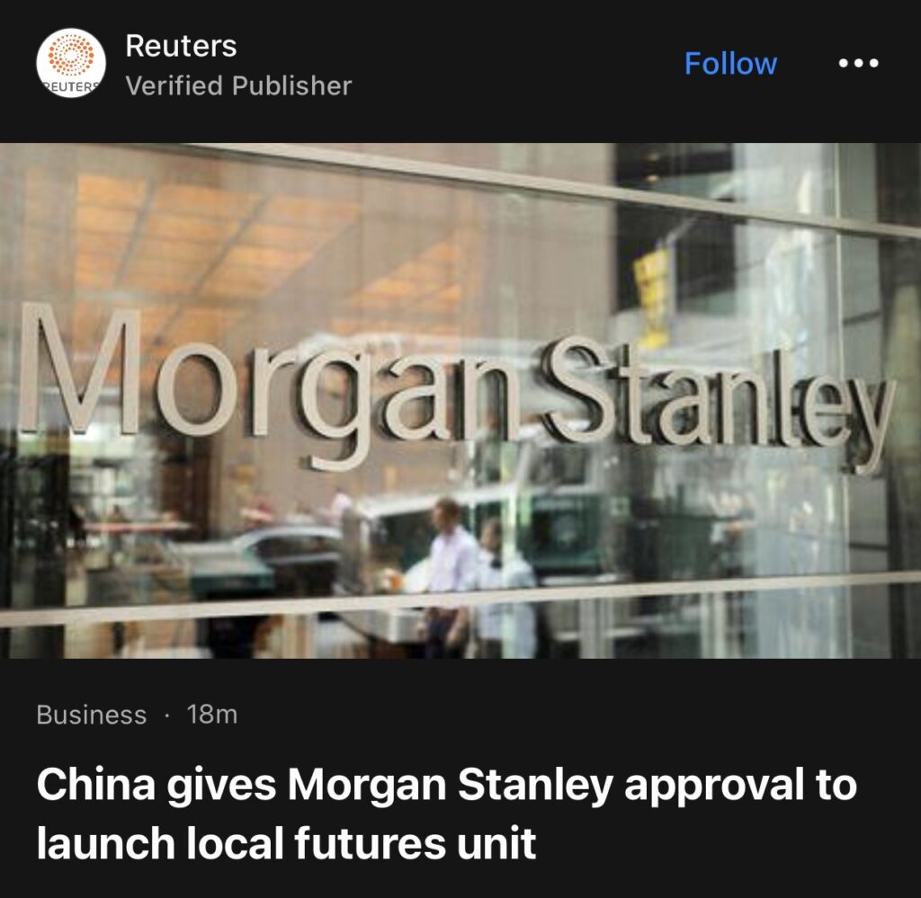 8。香港(路透社) – 摩根士丹利已获得最终批准,通过新成立的部门在中国开展期货业务,成为世界第二大经济体衍生品市场的第二家美国主要参与者。