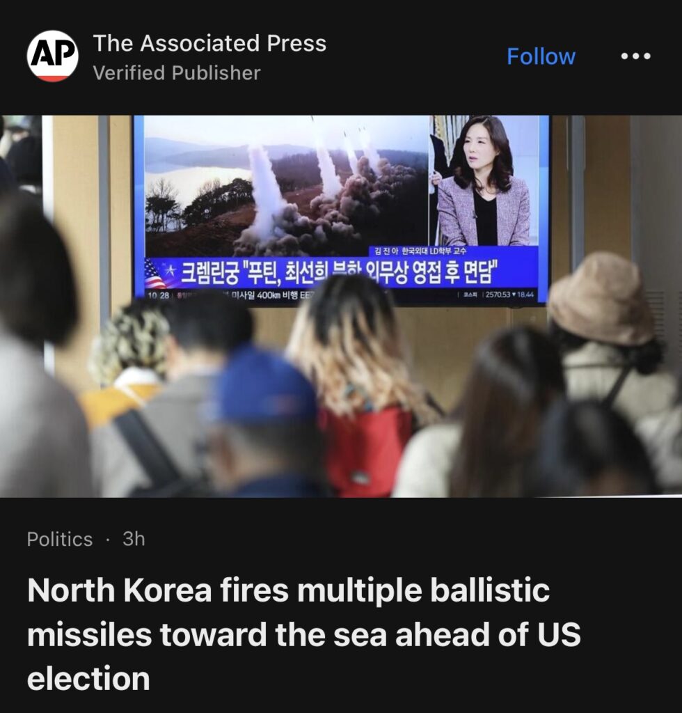 3。韩国首尔(美联社)——韩国军方表示,朝鲜周二向其东海发射了多枚短程弹道导弹。朝鲜在美国总统大选前数小时继续进行武器展示。