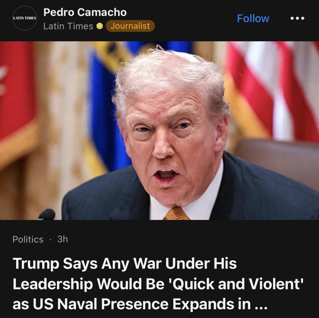 8。据Latin Times报道,特朗普称,在他领导下发生的任何战争都将是“迅速而暴力的”,与此同时,美国海军在加勒比海地区的存在正在扩大。