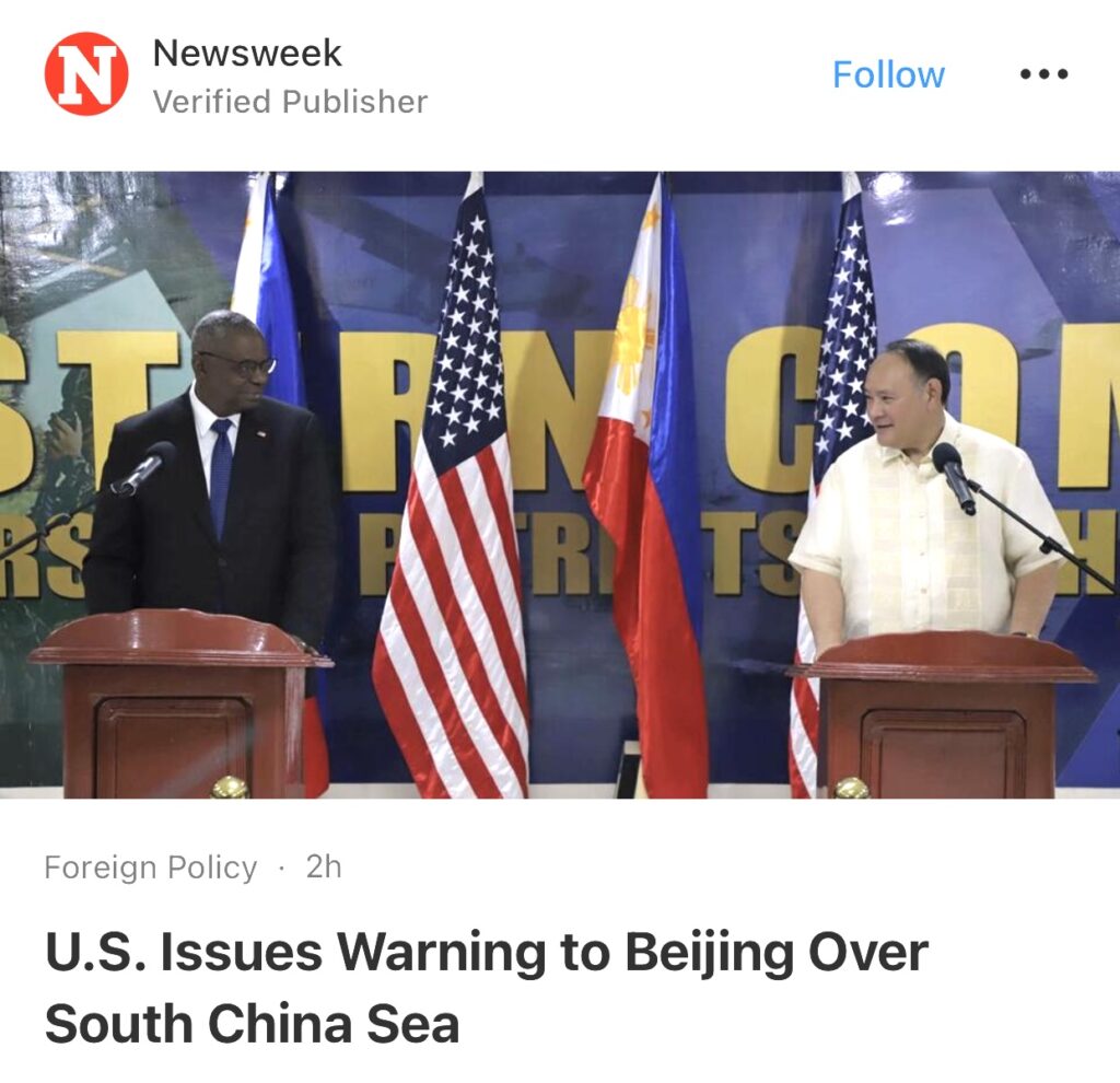 11。据Newsweek 报道,美国国防部长劳埃德·奥斯汀就南海问题向中国发出警告,强调如果菲律宾军队面临武装袭击,美国将保卫菲律宾。