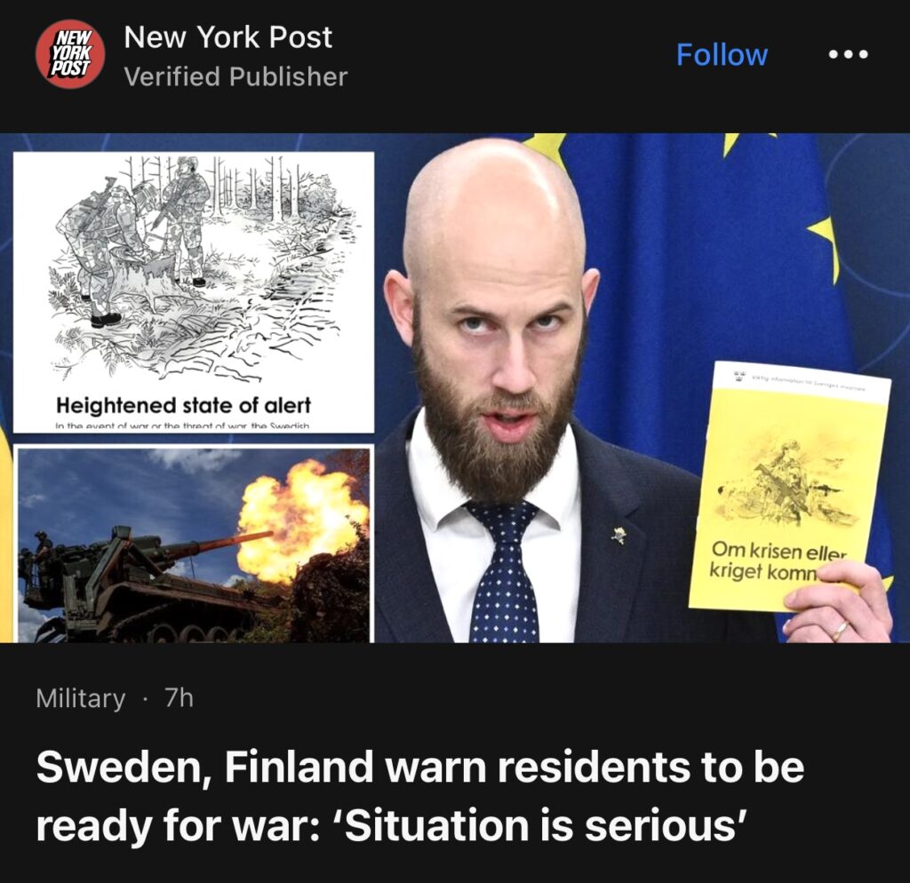 3。据New York Post报道,随着俄罗斯全面入侵乌克兰的进行,瑞典和芬兰都开始警告本国居民为可能发生的战争做好准备。斯德哥尔摩周一发布了最新版本的《应对危机或战争》小册子,指导平民如何做好准备并渡过一场国家危机,上次发行是在 2018 年。
