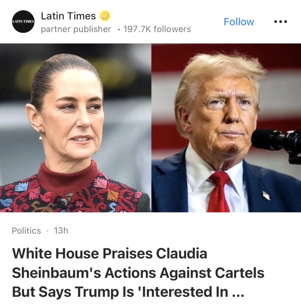 5。据Latin Times报道,白宫赞扬克劳迪娅·谢因鲍姆打击贩毒集团的行动,但表示特朗普“有意采取更多措施”。