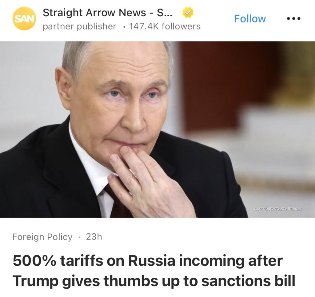 2。据Straight Arrow News报道,特朗普批准制裁法案后,对俄罗斯加征500%关税。