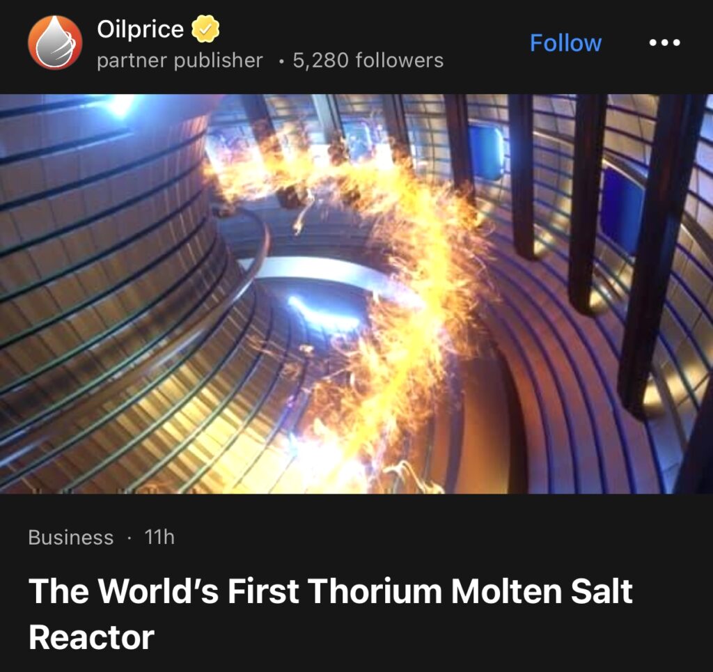 12。据Oilprice报道,世界首座钍熔盐反应堆。据报道,中国一座实验性核电站刚刚跨越了一个历史性的里程碑,成功运行了世界上首个钍基熔盐反应堆(TMSR)。中国科学院上海应用物理研究所成功将钍转化为铀,开创了历史性的先河,突破了一项重大的科学障碍。