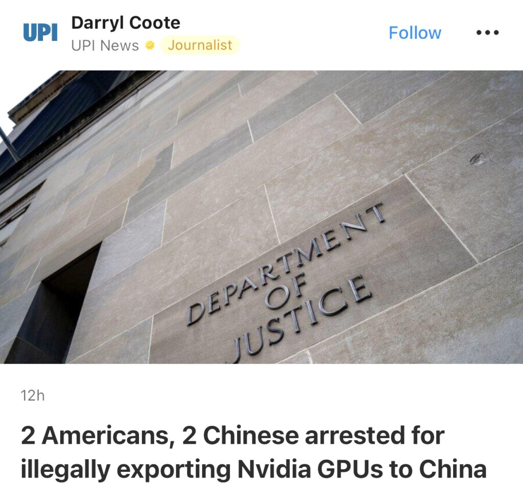 8。11 月 21 日(UPI)——联邦当局逮捕了四人,其中包括两名中国公民,他们被指控密谋非法向北京出口英伟达尖端人工智能技术。