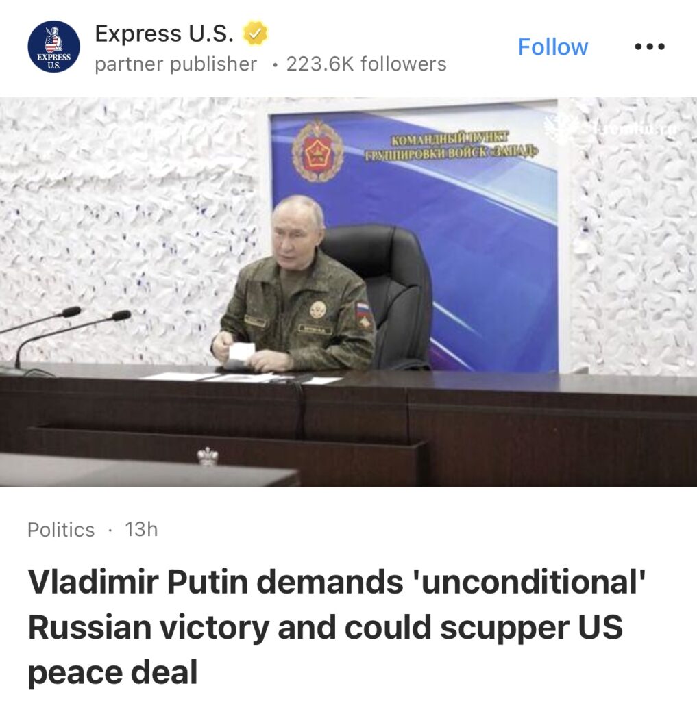 1。据Express U.S.报道,弗拉基米尔·普京要求俄罗斯“无条件”获胜,这可能会破坏美国与俄罗斯达成的和平协议。