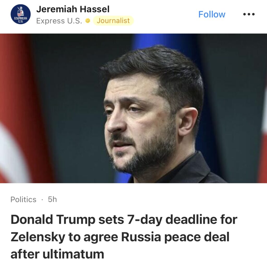 6。据Express U.S. 报道,唐纳德·特朗普发出最后通牒,设定了7天期限,要求泽连斯基同意与俄罗斯达成和平协议。