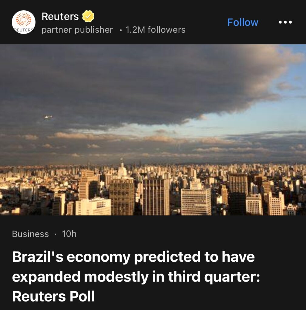 5。据Reuters报道,路透社民调预测,巴西经济第三季度将温和增长。