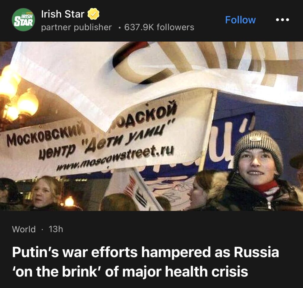 8。据Irish Star报道,俄罗斯濒临重大公共卫生危机,普京的战争努力受阻。由于乌克兰冲突持续不断,政府资金锐减,俄罗斯正处于艾滋病危机的边缘,新增病例激增。雪上加霜的是,俄罗斯禁止外国艾滋病慈善机构入境,同时对国际组织也采取了更广泛的打压措施。