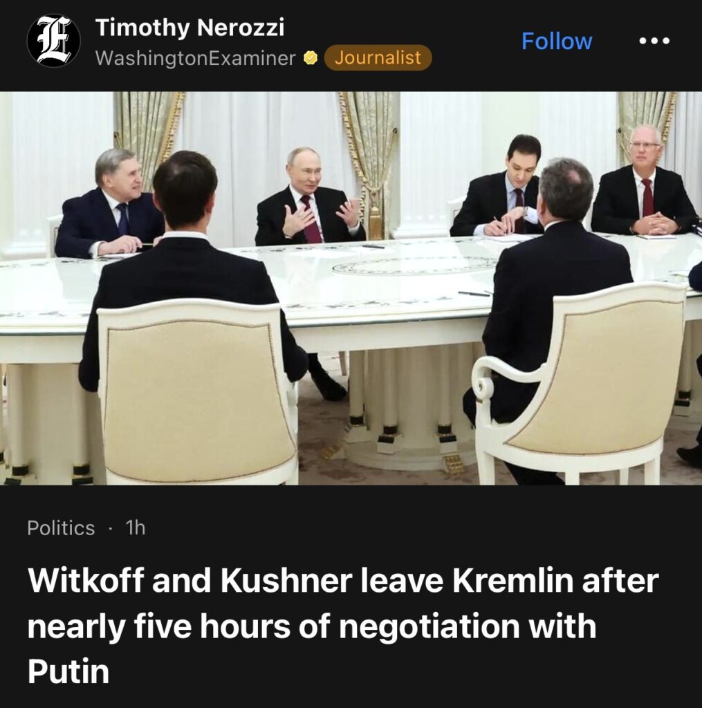 6。据WashingtonExaminer 报道,在与普京进行了近五个小时的谈判后,美国特使维特科夫和总统唐纳德·特朗普的女婿库什纳离开了克里姆林宫。