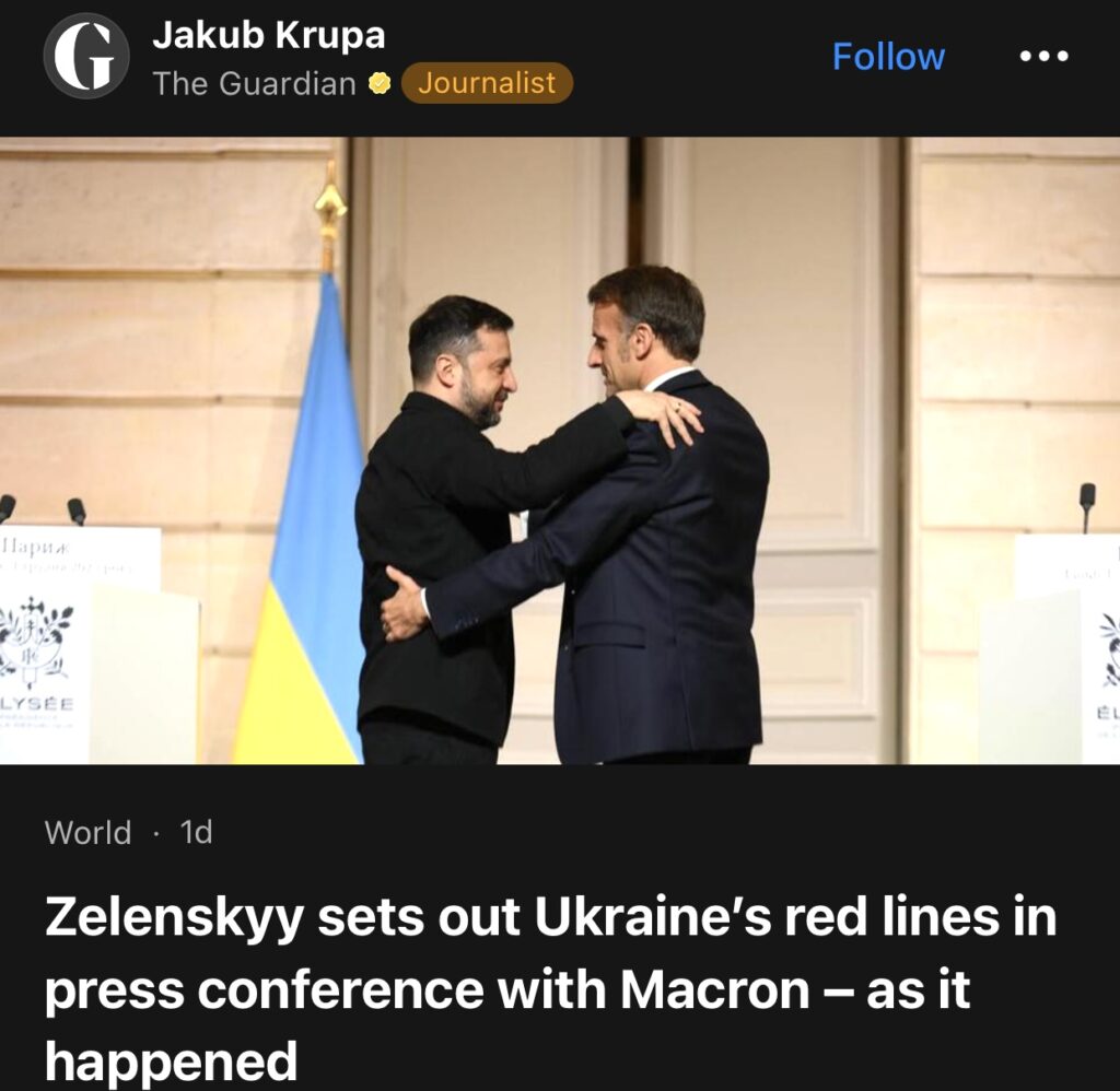 1。据The Guardian报道,泽连斯基在与马克龙举行的联合新闻发布会上阐明乌克兰的红线。