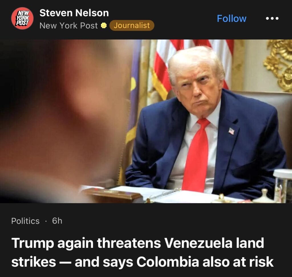 4。据New York Post报道,特朗普再次威胁要对委内瑞拉发动地面打击,并称哥伦比亚也面临风险。