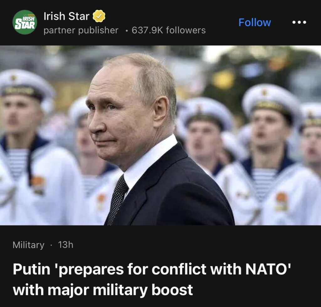 11。据Irish Star报道,普京大幅提升军力,为与北约的冲突做准备。
