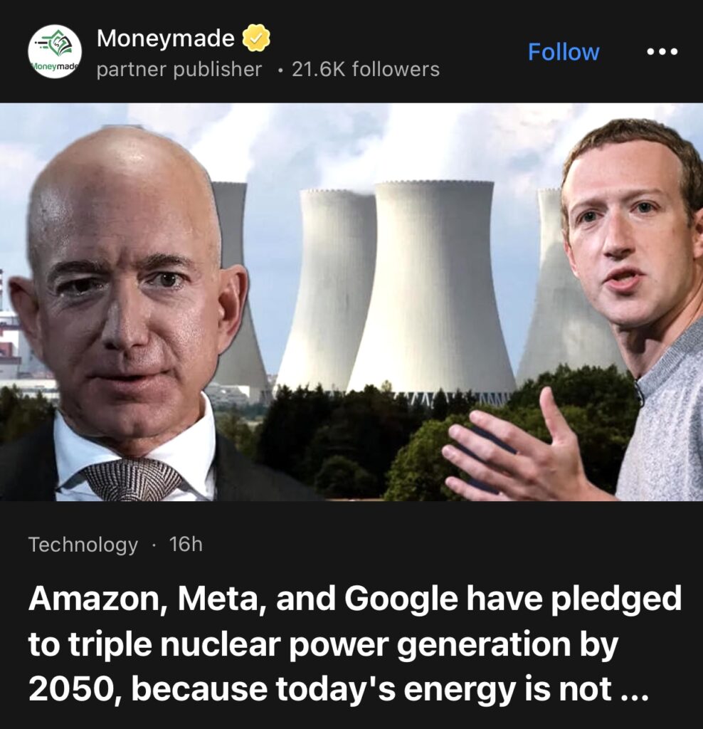 3。据Moneymade报道,亚马逊、Meta 和谷歌承诺到2050 年将核能发电量增加两倍,因为目前的能源不足以支持他们的 AI 计划。