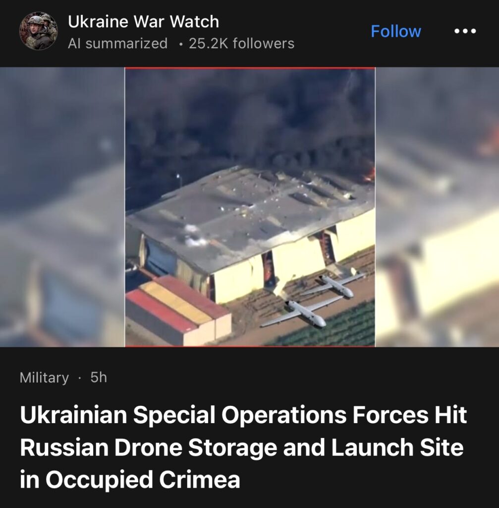 2。据Ukraine War Watch报道,乌克兰特种部队袭击了位于被占领克里米亚的俄罗斯无人机储存和发射基地。