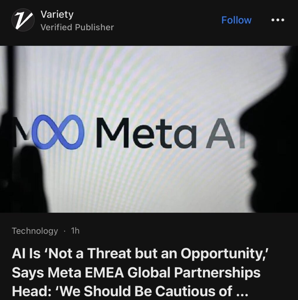 13。据Variety 报道,Meta EMEA 全球合作伙伴关系负责人表示,人工智能“不是威胁,而是机遇”:“我们应该谨慎对待神化它或害怕它”。
