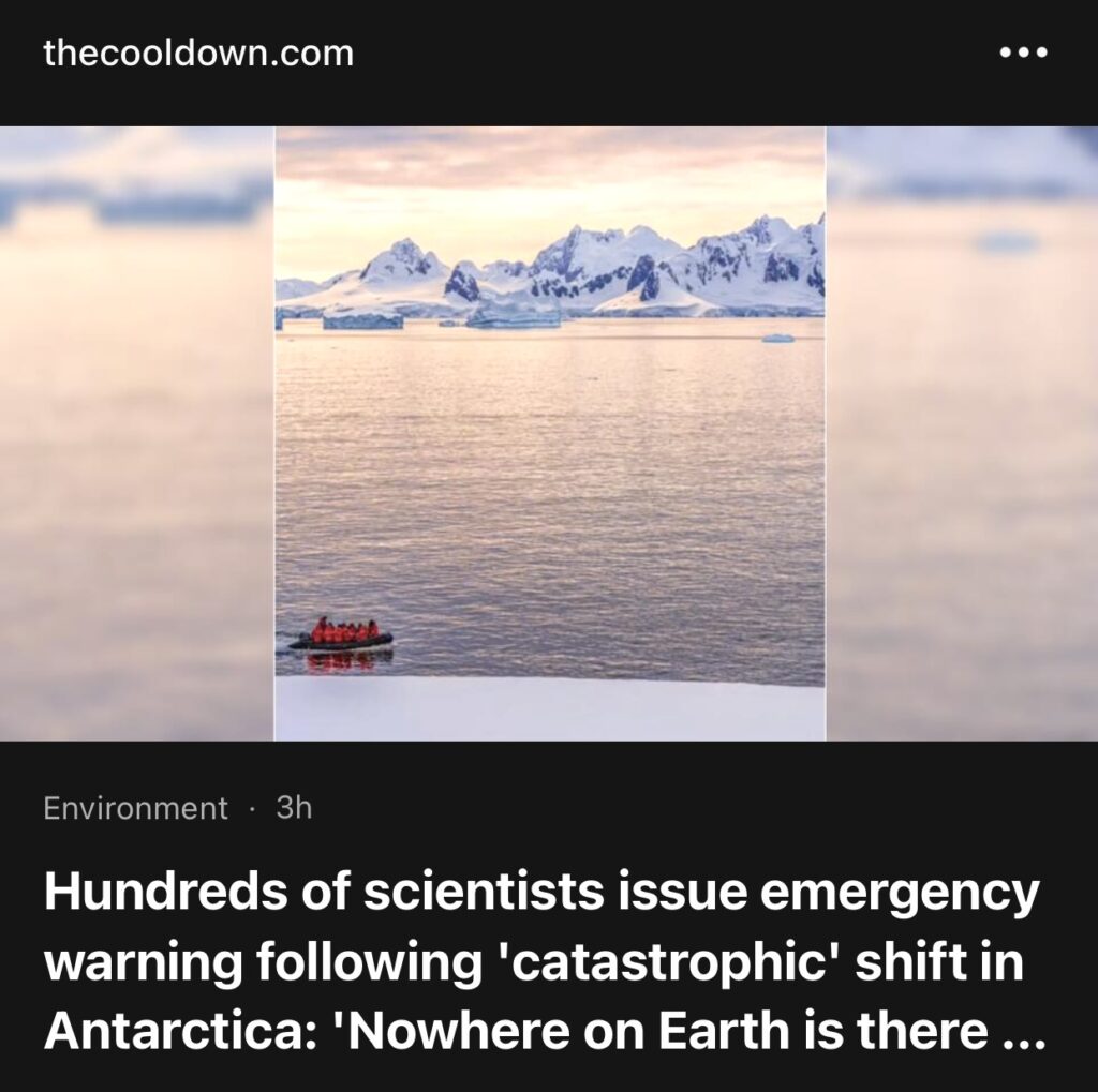 1。据TheCoolDown报道,数百名科学家在南极洲发生“灾难性”变化后发出紧急警告称:”地球上没有任何地方比这更能引起不确定性”。