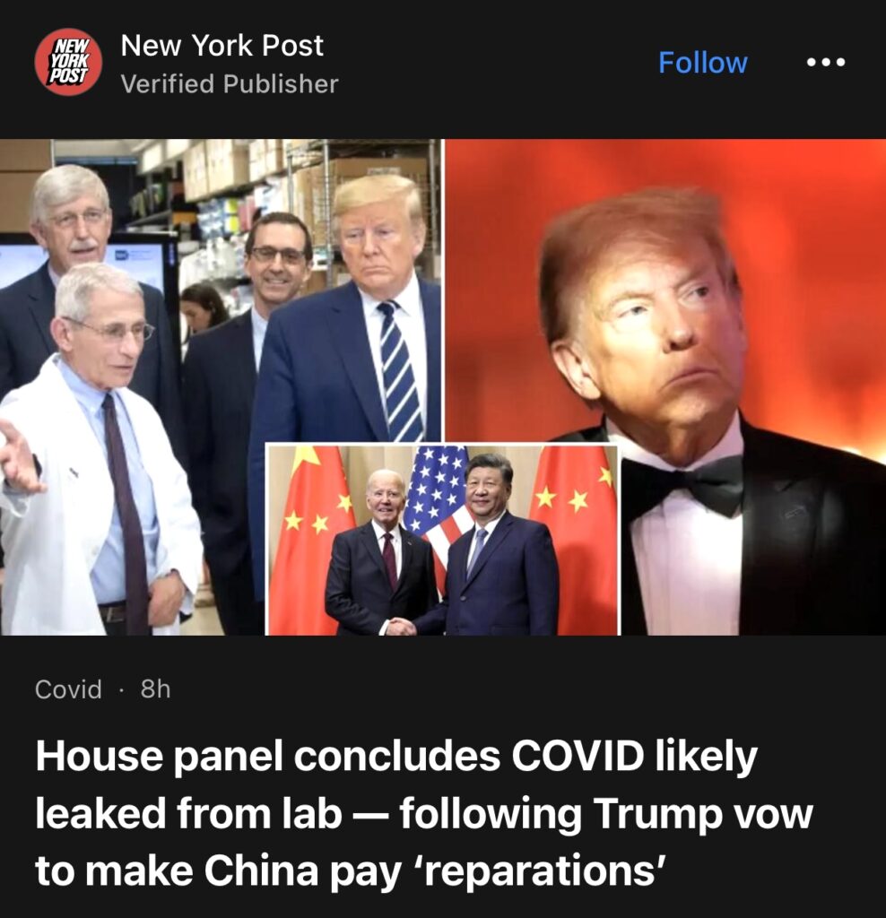 7。据New York Post华盛顿报道,在候任总统唐纳德·特朗普提议让北京支付数万亿美元“赔偿”后,众议院一个小组得出结论,COVID-19可能从一家部分由美国纳税人资助的中国实验室泄露,导致超过120万美国人死亡。
