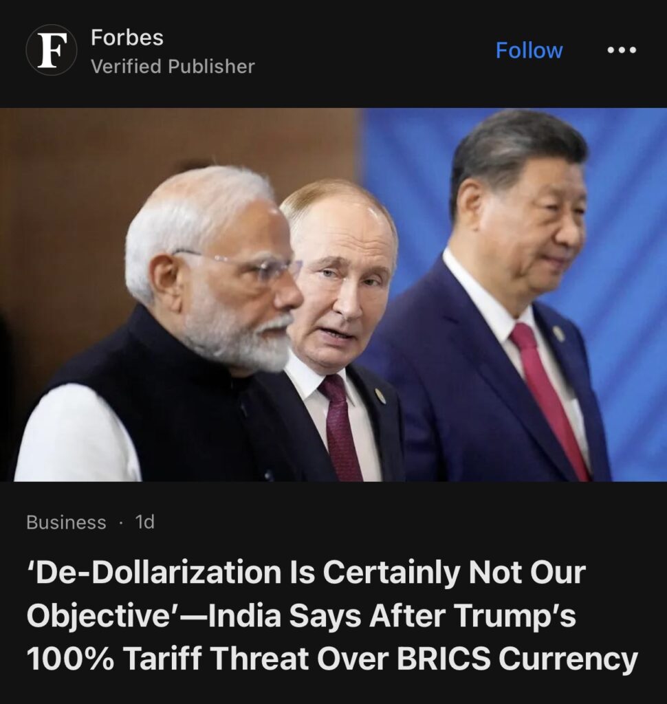 3。据Forbes报道”去美元化当然不是我们的目标”——印度在特朗普对金砖国家货币发出 100% 关税威胁后表示。