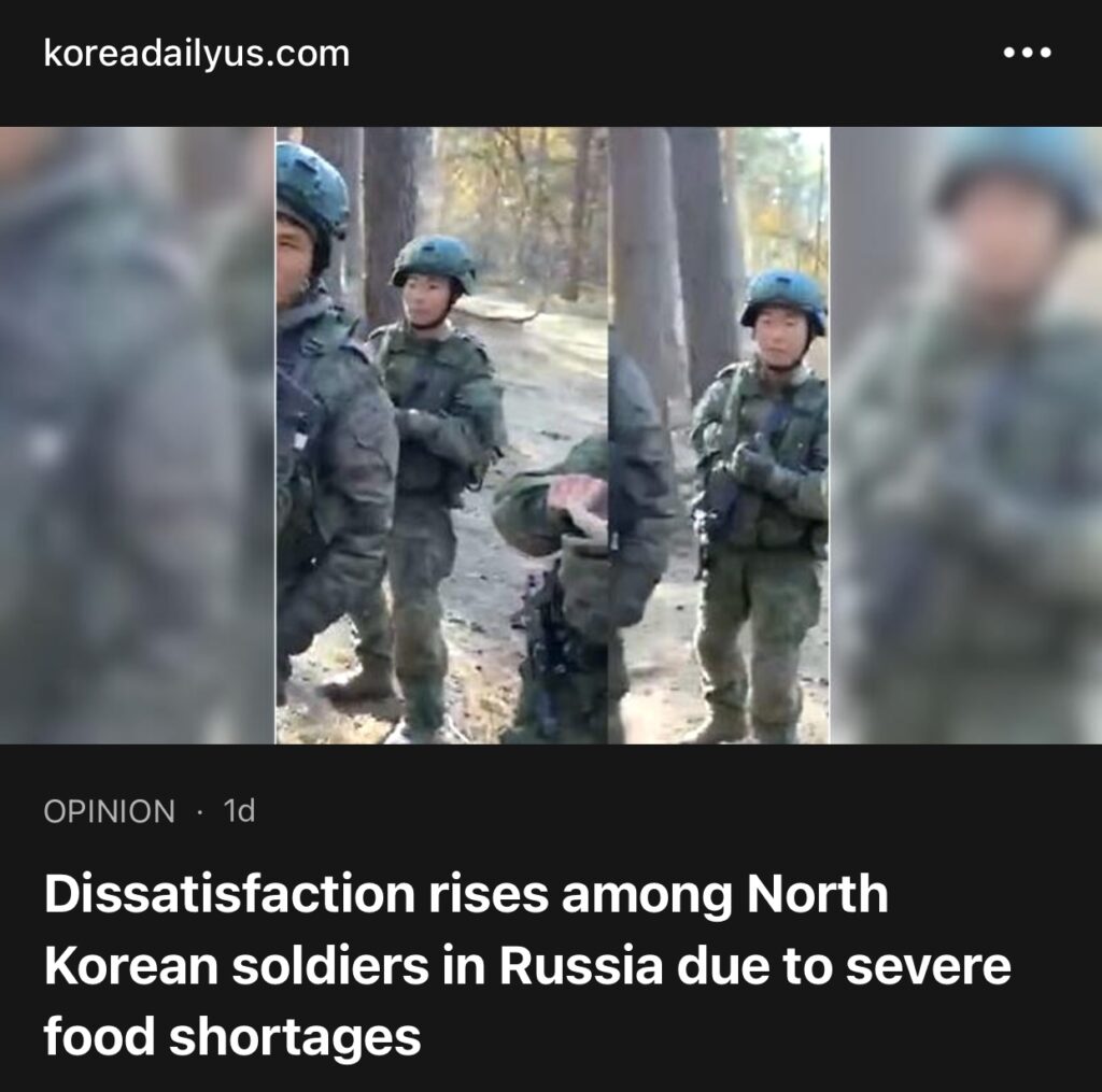 11。据TheKorea Daily 报道,食品严重短缺导致驻俄朝鲜士兵不满情绪上升。