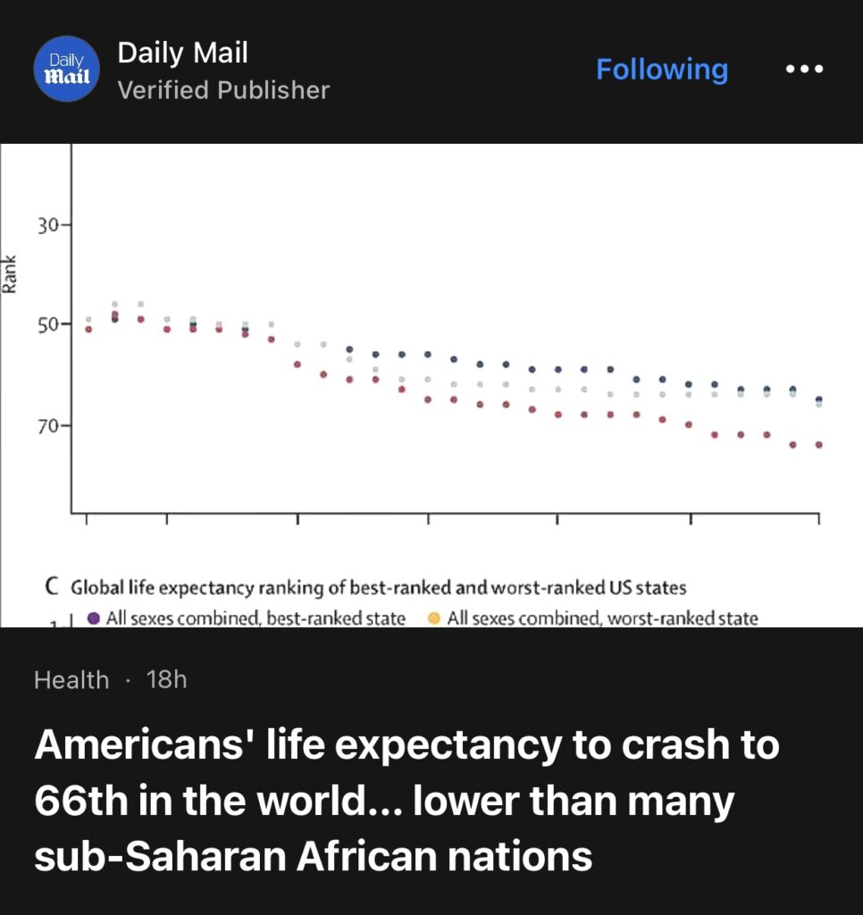 7。据Daily Mail报道,美国人的预期寿命将降至世界第 66 位……低于许多撒哈拉以南非洲国家。尽管是最富有的国家之一,美国人的死亡率却比近 50 个国家的同类人要早。根据《柳叶刀》的研究,“健康挑战的惊人轨迹”,包括猖獗的肥胖、吸毒和枪支自杀,将扩大这一差距。