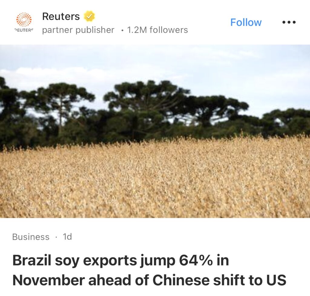 8。圣保罗,12 月 4 日(路透社)——巴西政府周四表示,11 月份巴西大豆出口量同比增长 64%,达到 420 万吨。良好的本地供应使得在世界最大进口国中国转向美国大豆之前,巴西大豆的出口量得以增加。