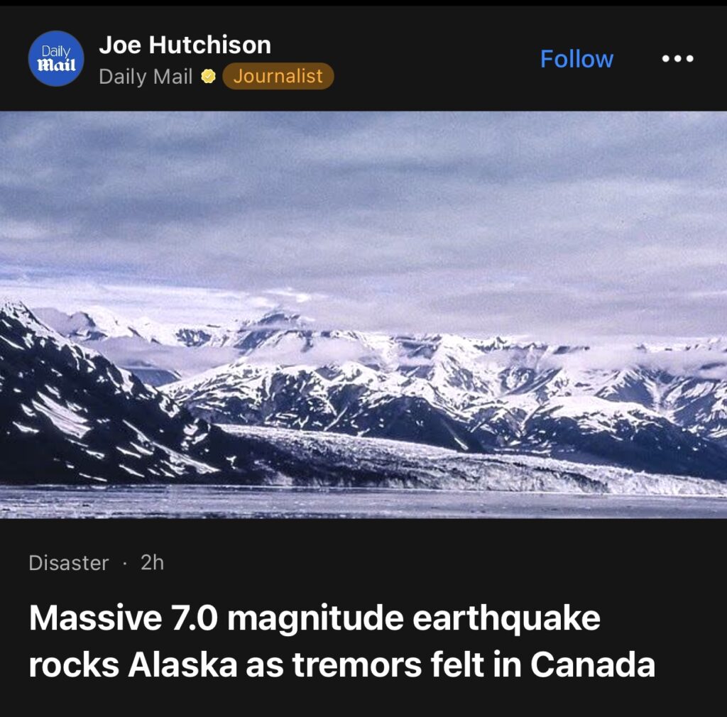 14。据Daily Mail报道,阿拉斯加发生7.0级强烈地震,加拿大也有震感。