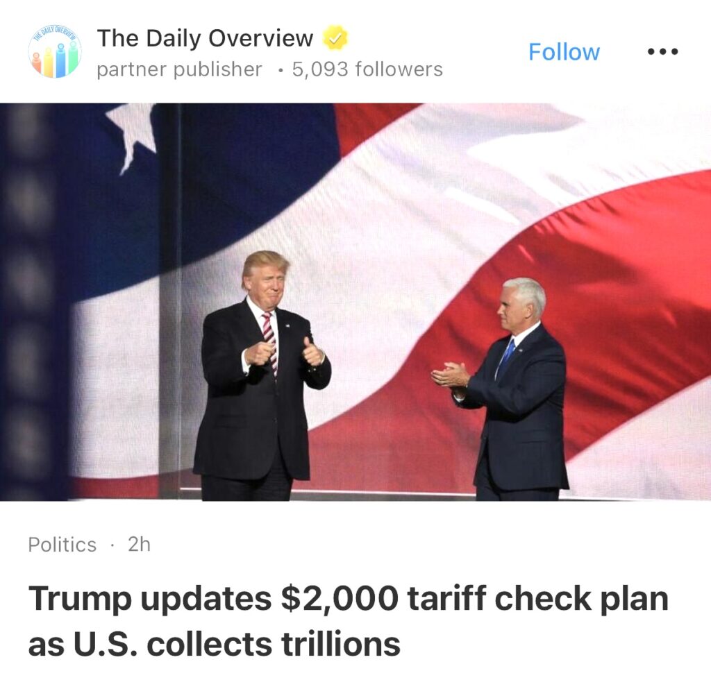 2。据The Daily Overview报道,特朗普更新2000美元关税支票计划,美国已征收数万亿美元关税。