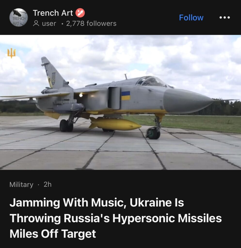 13。据Trench Art报道,乌克兰用音乐干扰,导致俄罗斯高超音速导弹偏离目标数英里。