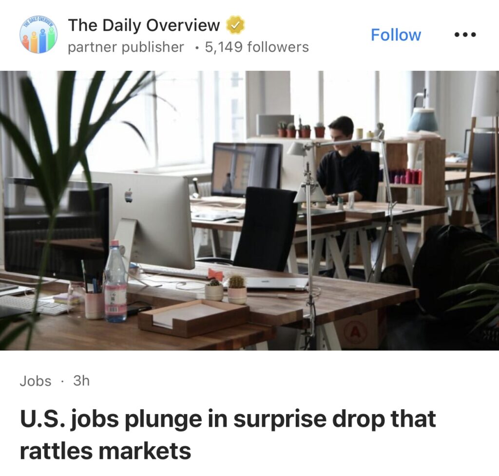 7。据The Daily Overview报道,美国就业人数意外暴跌,引发市场震荡。