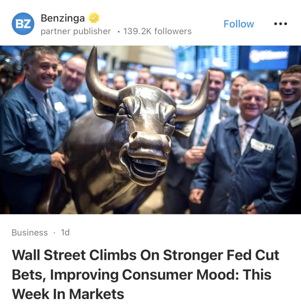 3。据Benzinga报道,受美联储降息预期增强和消费者信心改善提振,华尔街股市上涨。